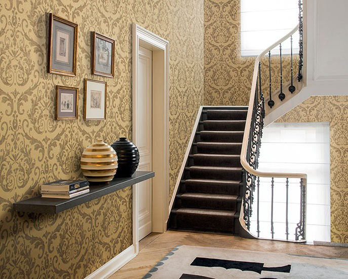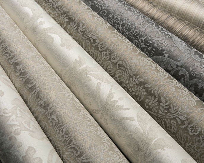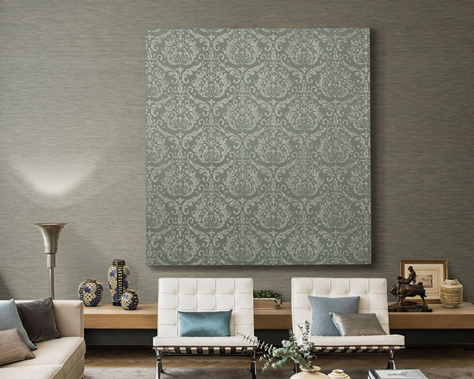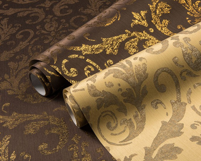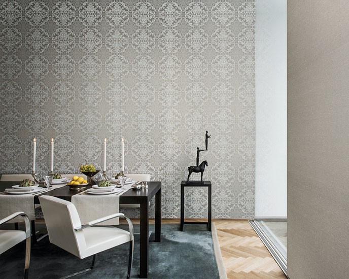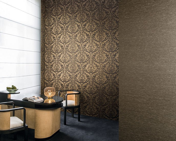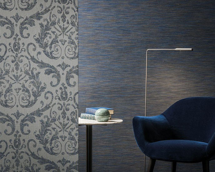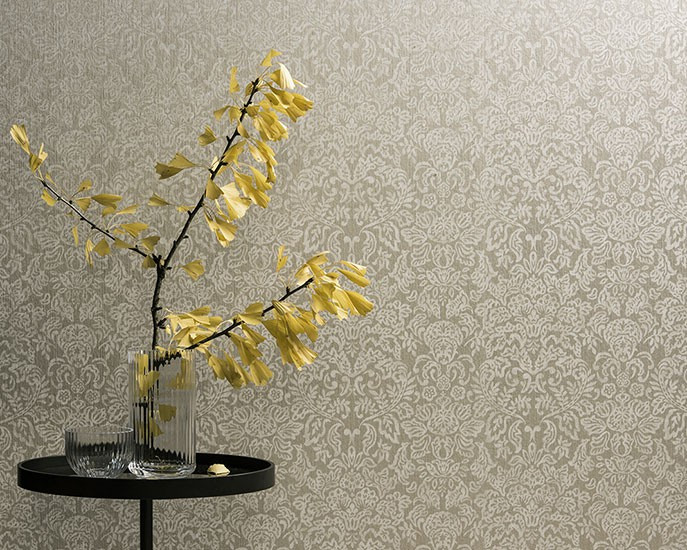 Damask designs reminiscent of 18th century palaces and mansions, ornamental patterns and floral motifs, classic yet with a contemporary twist are the main – and extremely elegant – themes in the new textile wallcovering collection of Omexco. Delicately printed – as if they were embroidered – on silky rayon yarns, they perfectly blend with the matching colourful space dyed plain items, or with the rather matt and natural look of plain linen yarns.