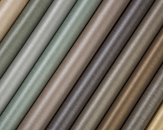 The combination of the silky aspect of the rayon yarns, either printed with matt or slightly metallic colours, either space dyed in magnificent tone-on-tone colours at one hand, and the irregular linen yarns enable endless combinations and variations to create either a very classic interior or a very contempary look – in both cases the wallcovering will adorn the walls with the cosy and luxurious touch which only textile wallcovering can give.
