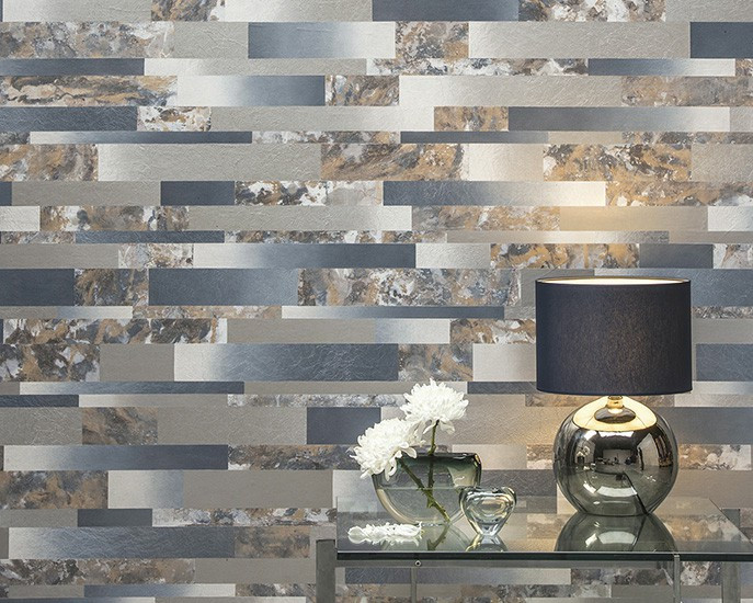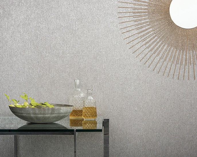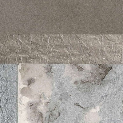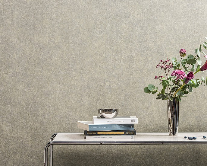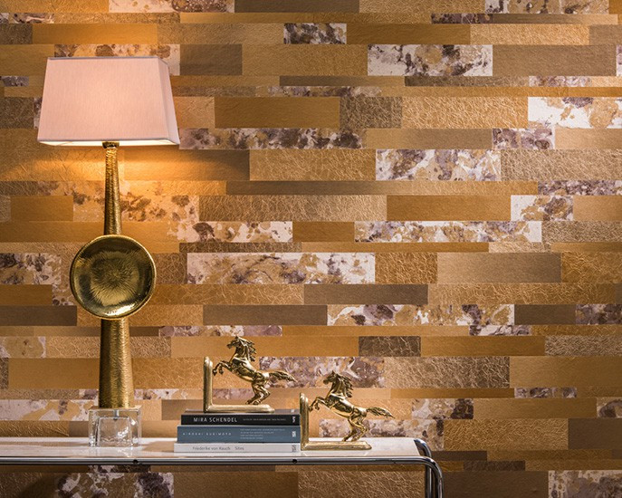 - a handmade collage of marbled paper, in tone-on- tone colours with multiple shimmers of gold, silver or copper - an iridescent embossed non-woven sheet with silver glow, subdued by matt effects.