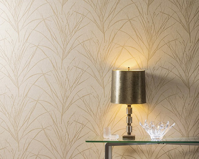An ethereal herb design with japanese influences breathes lightness into the range, whereas the matching plains have a place of honour as well: oxidized non-woven wallcovering in untamed colours, or motifs of delicate squares enhanced with iridescent stripes, merging into a hazy plain.