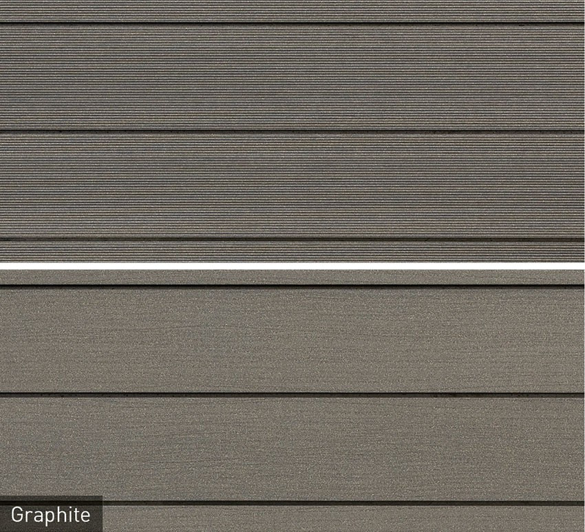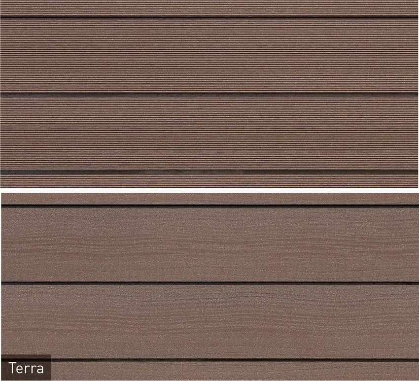 Boards from the Glacier range are characterised by the mix of two varying sides. As it can be laid on both sides, the Glacier16 board boasts a finely corrugated surface on one side and a surface with wood character on the other. Randomly placed, curved structures give the surface a visual dynamic. The extra wide deck boards are available for purchase in terra and graphite and are a real eye-catcher as well!